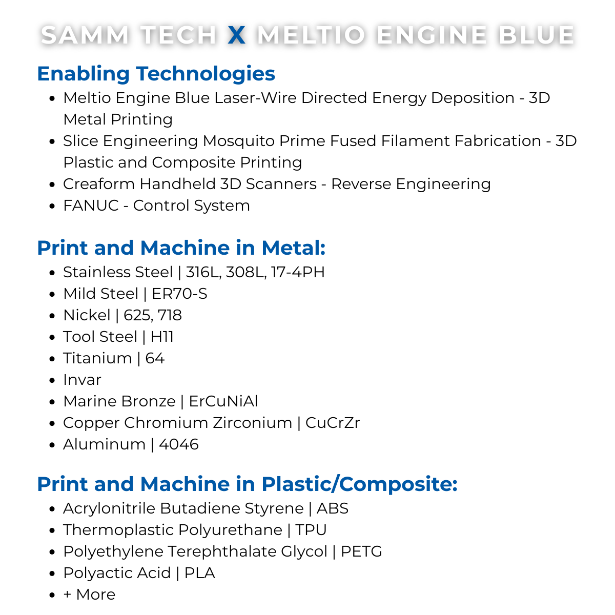 The SAMM Tech Model SAMM-DM010S-5AM is a cutting-edge, fully integrated advanced manufacturing system designed for expeditionary use. Housed within a compact 10-foot MILVAN shipping container, SAMM Tech combines additive and subtractive manufacturing capabilities to deliver on-demand repair, replacement, and prototype production directly at the point-of-need. This model integrates advanced hybrid material capabilities, enabling fabrication in both metal and plastic. Its modular, portable design and robust construction enable operations in extreme environments, both on land and at sea, while remaining compatible with existing logistics infrastructure for global mobility.