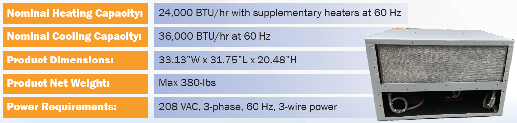 This unit is a fiberglass composite, horizontal, compact ECU that boasts a lightweight, single-unit design that provides filtered cooled and heated air for the Landing Craft, Air Cushion (LCAC) vehicles. Trusted by the Department of the Navy for use on their LCACs and ship-to- shore connector hovercrafts, this unit features an electric motor that allows for continuous operation under varying loads. This design is highly corrosion resistant with an epoxy coated composite case, Heresite coated aluminum internals, stainless steel hardware, and insulated and corrosion resistant coated refrigeration copper.